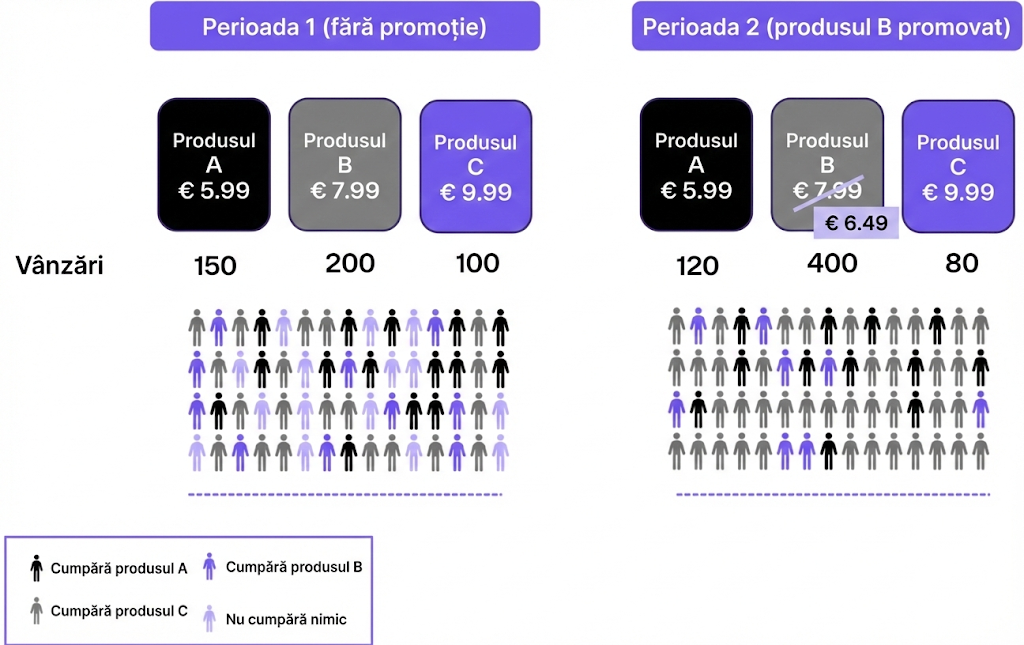 • Efectul de „Canibalizare”: Promoția la produsul A i-a făcut pe clienți să nu mai cumpere produsul B (care poate avea o marjă mai bună)?