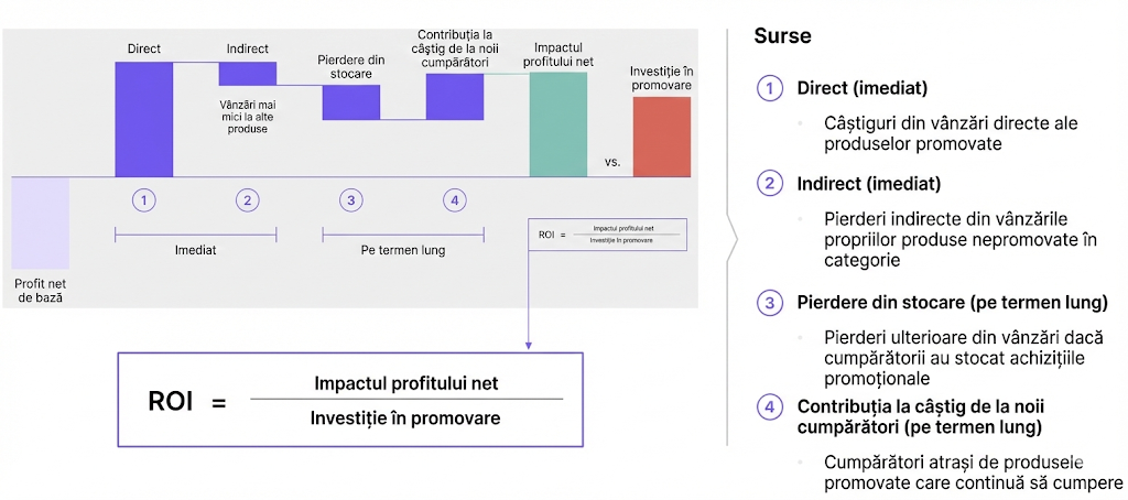 • ROI-ul Net: După ce scazi costul reducerii, costul marketingului și pierderile prin canibalizare, câți bani au rămas efectiv în firmă?